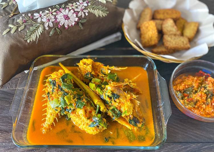 - Masukkan potongan ikan,masak hingga mendidih dan ikan matang. Tambahkan daun kemangi dan daun bawang,koreksi rasa. Angkat..