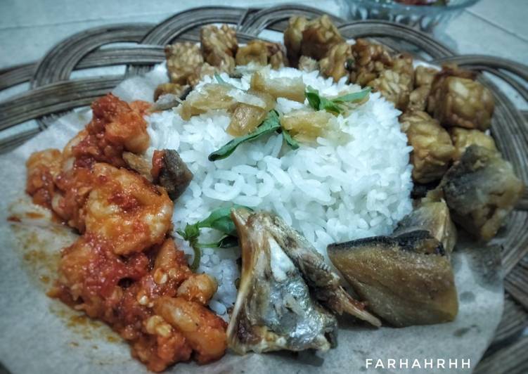 - Sajikan bersama potongan ikan asin, dan telur rebus. (Saya lupa merebus telurnya 🤭) saya tambahkan udang balado. Selamat menikmati nasi bekepor🙏.