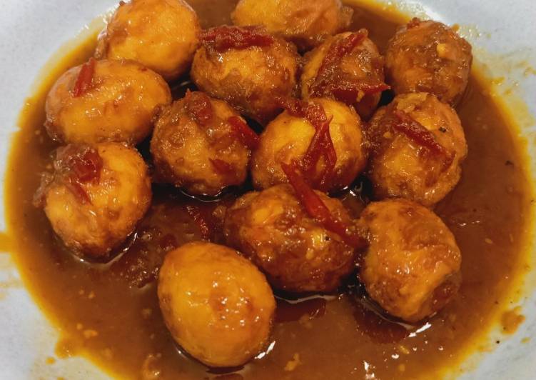 - Goreng telur puyuh hingga berwarna kekuningan tiriskan.
