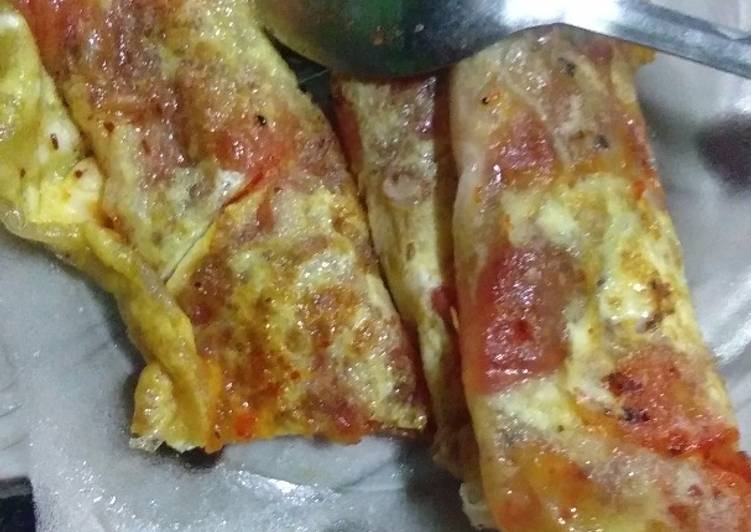 - Masukkan 3 sdm telur kocok kedalam wajan, kemudian masukkan adonan tepung (usahakan setipis mungkin).
