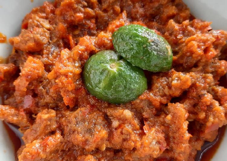 - Uleg bawang putih, cabai merah, cabai pedas, terasi, garam, gula hingga halus..