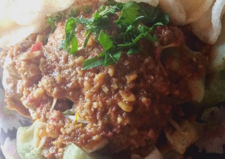 - Siapkan irisan lontong taruh tahu yg sdh digoreng td..lalu beri irisan kol dan kecambah diatasnya...tuangkan sambal kacang nya td..beri irisan seledri...dan terakhir dikasih toping kerupuk...selamat mencoba.